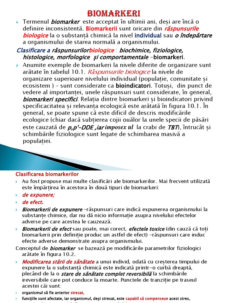 Biomarkerii sunt oricare din rspunsurile biologice la o substan chimic la nivel individual sau o ndeprtare a organismului de starea normal a organismului. Clasificare a rspunsurilorbiologice : biochimice, fiziologice, histologice, morfologice i comportamentale -biomarkeri. Anumite exemple de biomarkeri la nivele diferite de organizare sunt artate n tabelul 10.1. Rspunsurile biologice la nivele de organizare superioare nivelului individual (populaie, comunitate i ecosistem ) sunt considerate ca bioindicatori. Totui, din punct de vedere al importanei, unele rspunsuri sunt considerate, n general, biomarkeri specifici. Relaia dintre biomarkeri i bioindicatori privind specificacitatea i relevana ecologic este artat n figura 10.1. n general, se poate spune c este dificil de descris modificrile ecologice (chiar dac subierea cojii oulor la unele specii de psri este cauzat de p,p'-DDE ,iar imposex ul la crabi de TBT), ntruct i schimbrile fiziologice sunt legate de schimbarea masiv a populaiei.