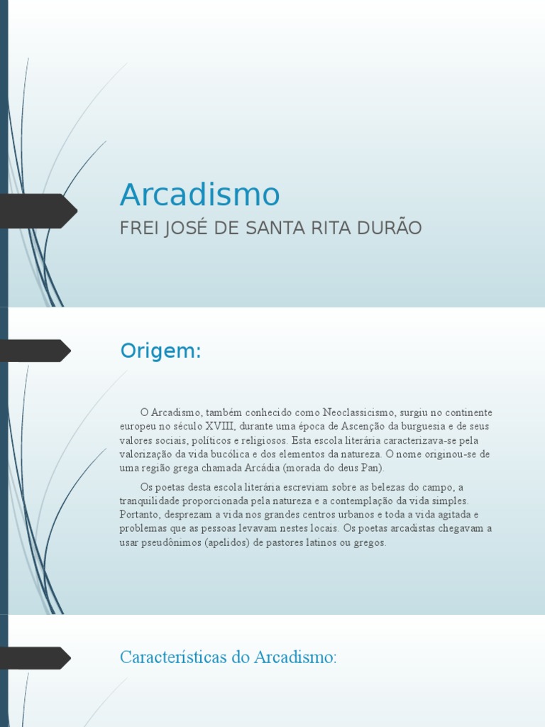 O Arcadismo, tambm conhecido como Neoclassicismo, surgiu no continente