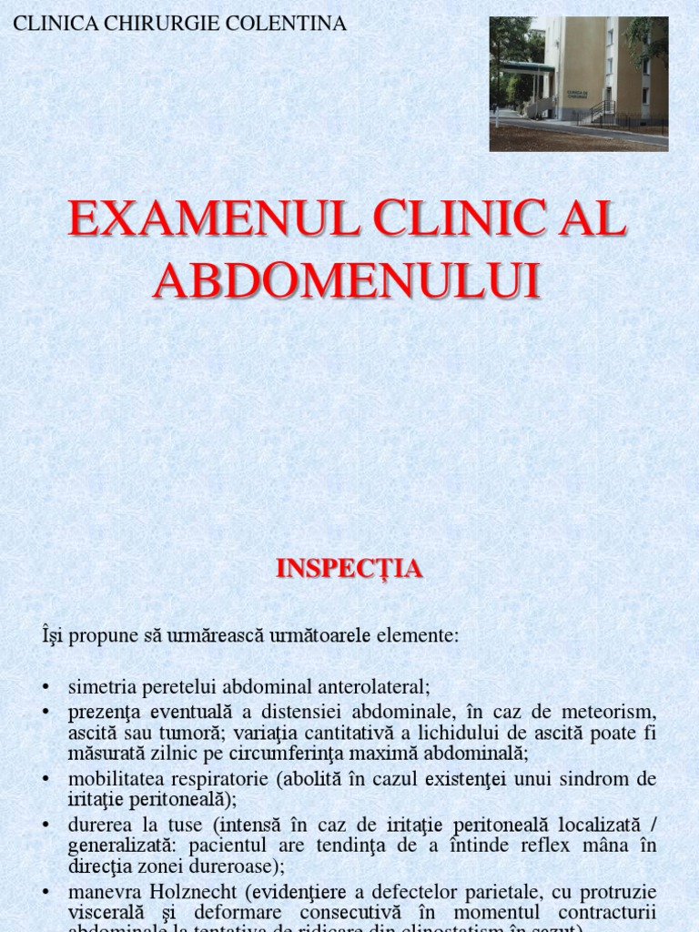 la inspecie: distensie abdominal; la slabi se observ n fazele iniiale micri peri-