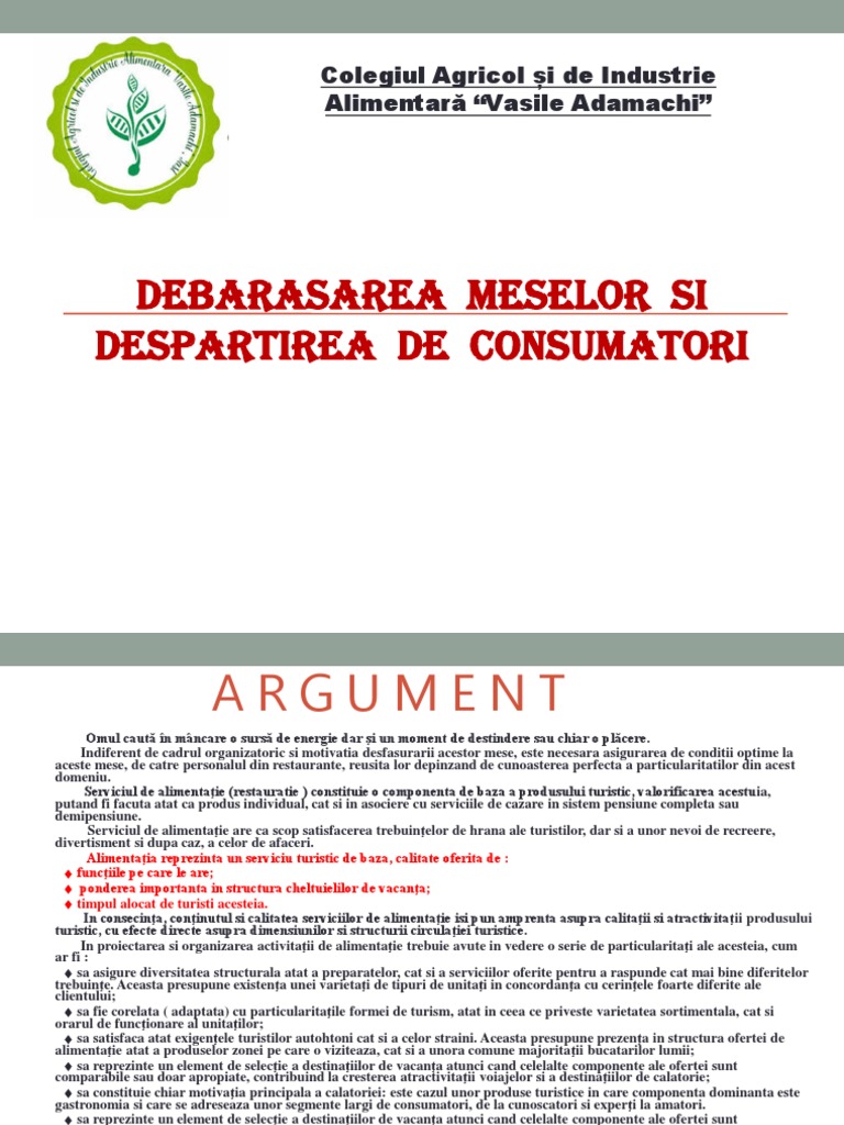 Serviciul de alimentaţie (restauratie ) constituie o componenta de baza a produsului turistic, valorificarea acestuia,