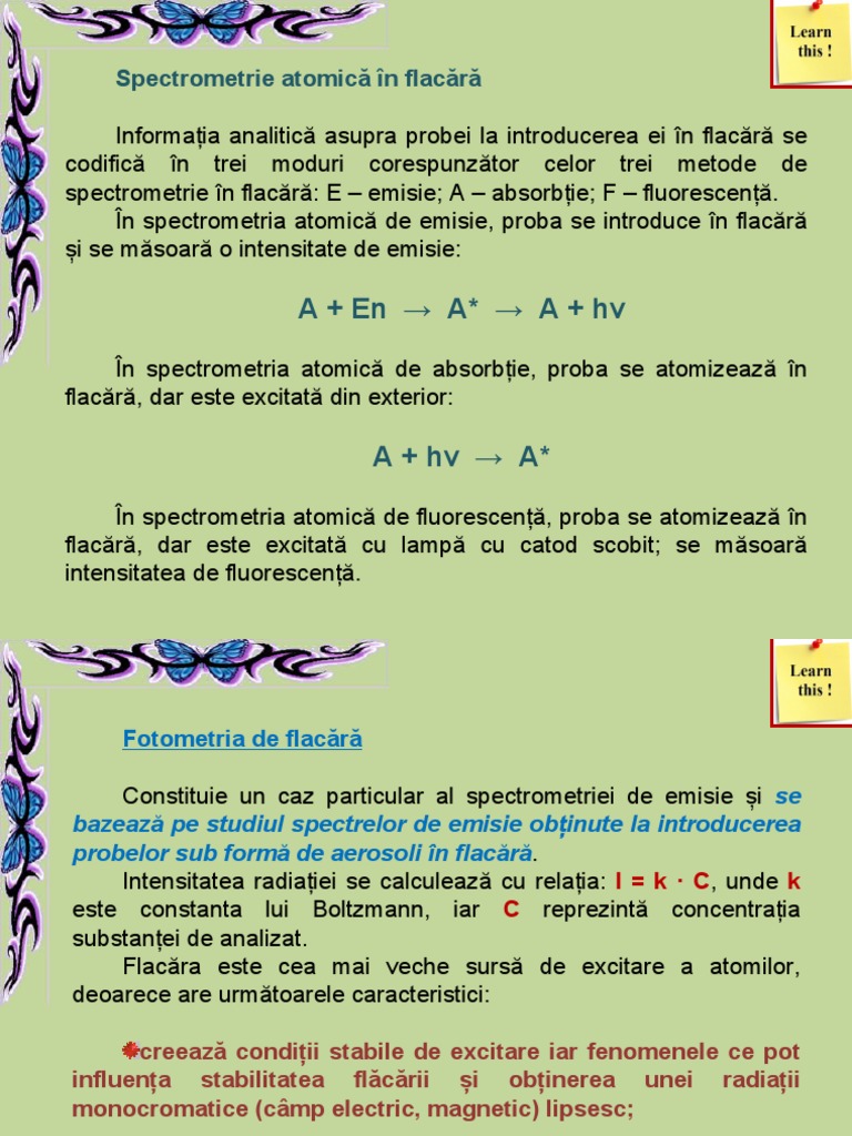 spectrometrie în flacără: E – emisie; A – absorbție; F – fluorescență.