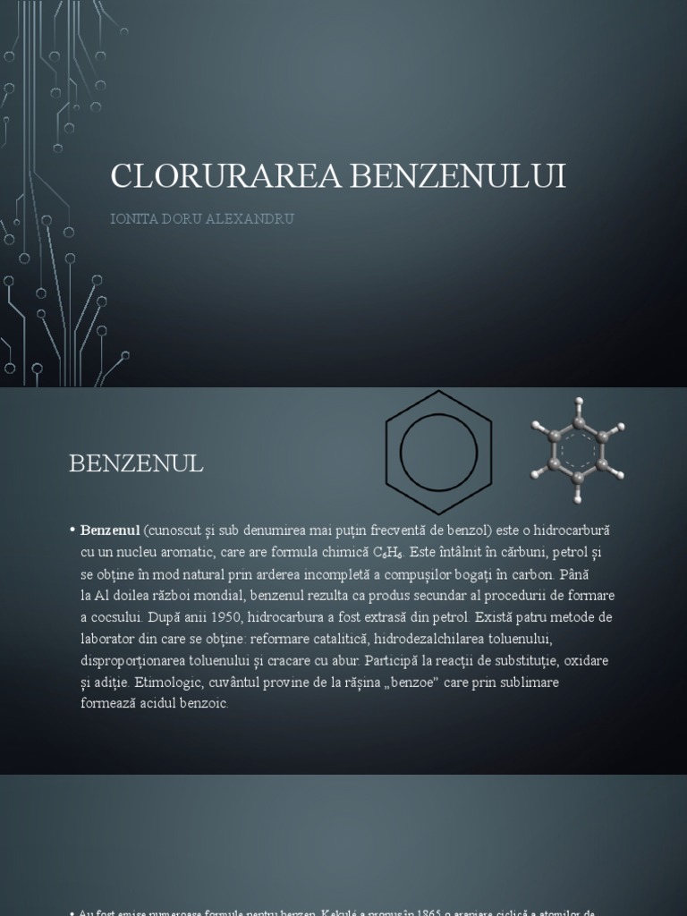 • Benzenul (cunoscut și sub denumirea mai puțin frecventă de benzol) este o hidrocarbură