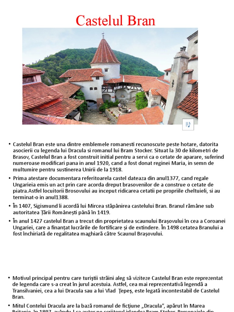• Castelul Bran este cunoscut de turiştii din întreaga lume drept Castelul lui Dracula. Acesta