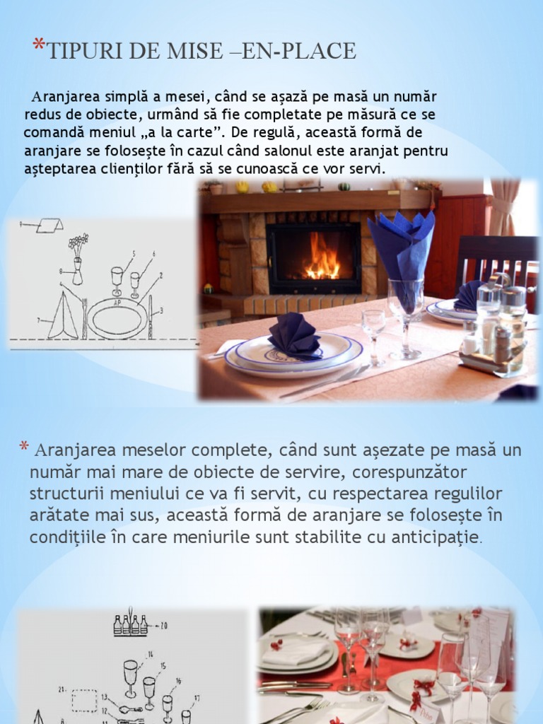 * Aranjarea meselor complete, când sunt aşezate pe masă un