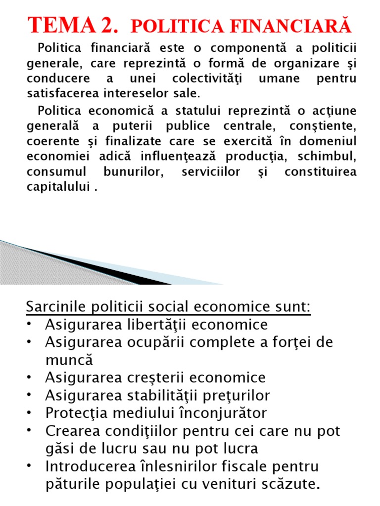 1. Politica financiară (include politica bugetar-fiscală şi cea