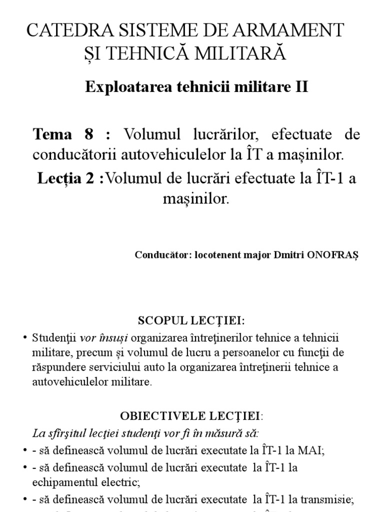 • Studenţii vor însuși organizarea întreţinerilor tehnice a tehnicii