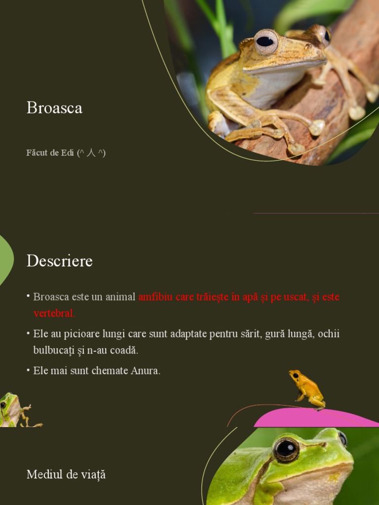 • Broasca este un animal amfibiu care trăiește în apă și pe uscat, și este