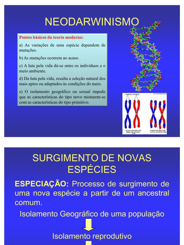 Pontos bsicos da teoria moderna: a) As variaes de uma espcie dependem de mutaes. b) As mutaes ocorrem ao acaso. c) A luta pela vida d-se entre os indivduos e o meio ambiente. d) Da luta pela vida, resulta a seleo natural dos mais aptos ou adaptados s condies do meio. e) O isolamento geogrfico ou sexual impede que as caractersticas do tipo novo misturem-se com as caractersticas do tipo primitivo.