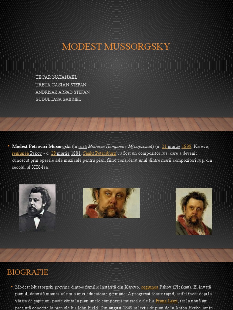• Modest Musorgski aparținea Grupului Celor Cinci (alături de Mili Balakirev, Cezar Antonovici Cui,