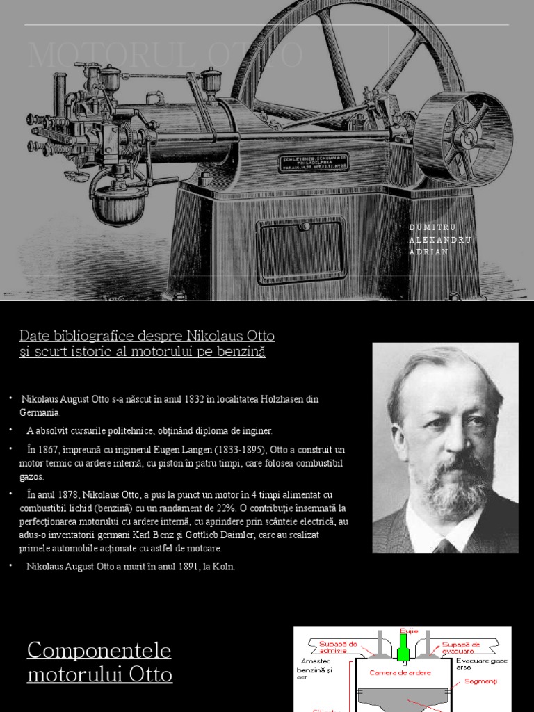 • În anul 1878, Nikolaus Otto, a pus la punct un motor în 4 timpi alimentat cu