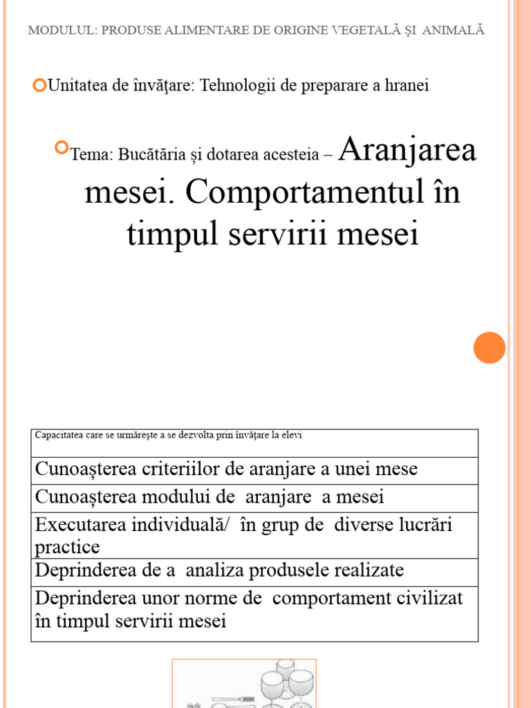 Cunoașterea criteriilor de aranjare a unei mese