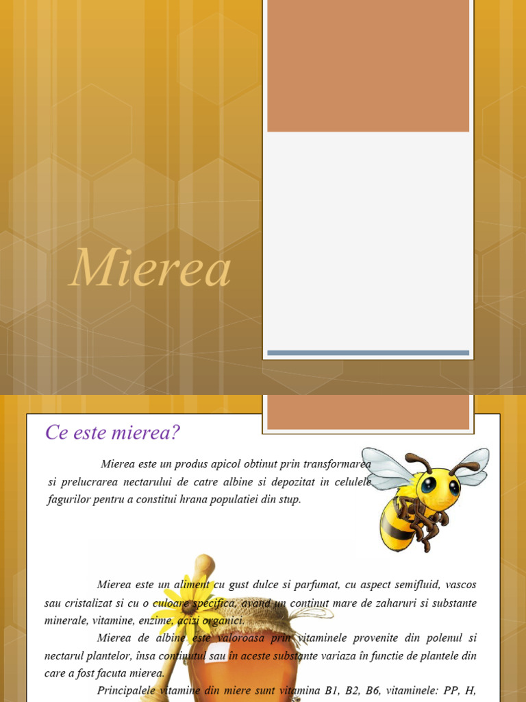 Mierea este un aliment cu gust dulce si parfumat, cu aspect semifluid, vascos