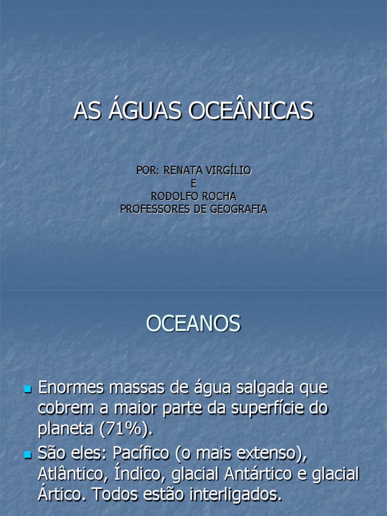 Enormes massas de gua salgada que cobrem a maior parte da superfcie do planeta (71%). So eles: Pacfico (o mais extenso), Atlntico, ndico, glacial Antrtico e glacial rtico. Todos esto interligados.