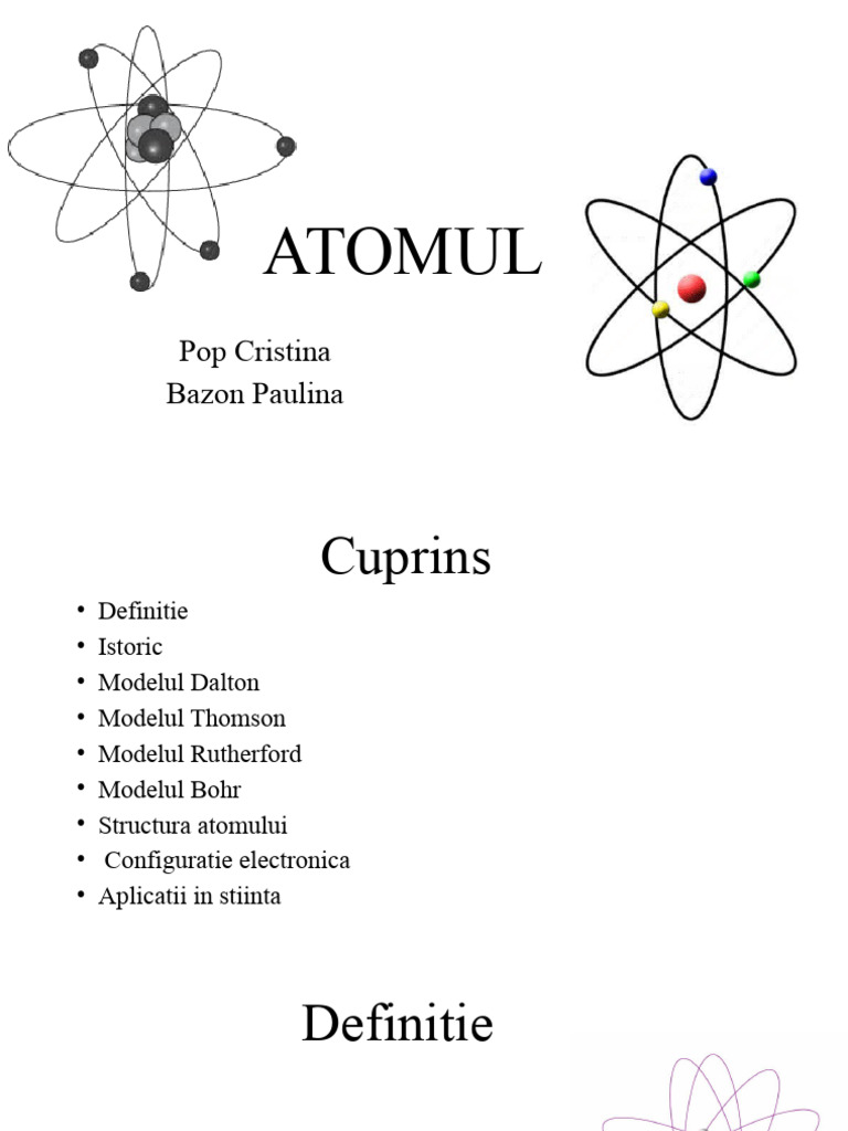 • Fiecare atom este format dintr-un nucleu și din unul sau mai