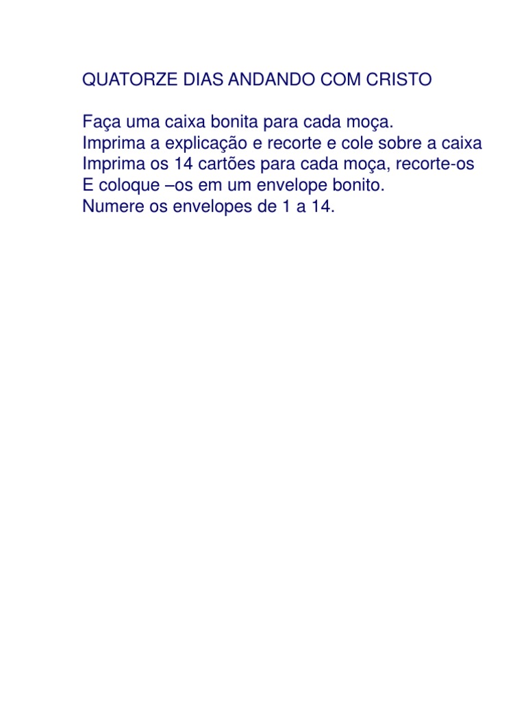 Imprima a explicao e recorte e cole sobre a caixa Imprima os 14 cartes para cada moa, recorte-os E coloque os em um envelope bonito. Numere os envelopes de 1 a 14.