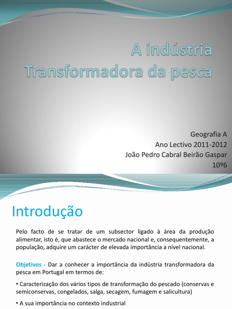 Pelo facto de se tratar de um subsector ligado rea da produo alimentar, isto , que abastece o mercado nacional e, consequentemente, a populao, adquire um carcter de elevada importncia a nvel nacional. Objetivos - Dar a conhecer a importncia da indstria transformadora da pesca em Portugal em termos de: Caracterizao dos vrios tipos de transformao do pescado (conservas e semiconservas, congelados, salga, secagem, fumagem e salicultura) A sua importncia no contexto industrial