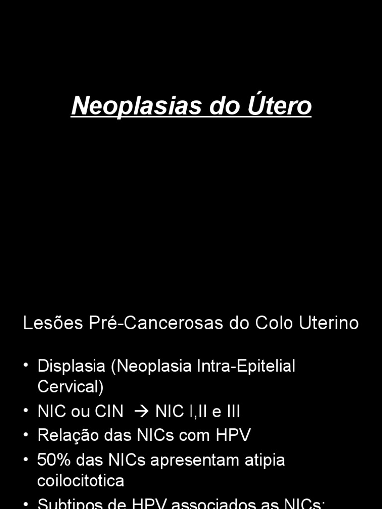 Displasia (Neoplasia Intra-Epitelial Cervical) NIC ou CIN NIC I,II e III Relao das NICs com HPV 50% das NICs apresentam atipia coilocitotica Subtipos de HPV associados as NICs: 16,18,31,33,35 e 45 Comportamento biolgico